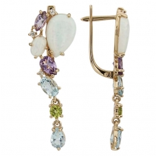 Для ярких женщин – оригинальное сочетание большого кабошона и обрамления из маленьких сверкающих самоцветов. Украшения выдержаны в одной цветовой гамме и подходят как для строгих, так и более свободных нарядов. Обратите внимание на глубинное сияние опала или бирюзы, подчеркнутое ярким блеском голубого топаза. Такие серьги микс помогают создать романтичный и утонченный образ женщине.